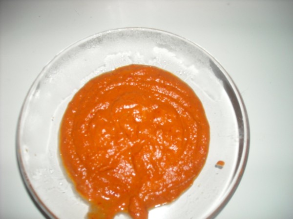 Abbrustolite il peperone sopra una piastra oppure nel forno molto caldo. Quando é completamente annerito, chiudetelo in un sacchetto oppure mettetelo in una ciotola coperta per 10 minuti. Poi spellatelo, facendo attenzione a eliminare completamente le pellicine. Strofinatelo delicatamente con un foglio di carta assorbente. Aprite il peperone ed eliminate i semi e i filamenti presenti all' interno. Poi tagliatelo a dadi. Mettete la gelatina in una ciotola di acqua fredda per qualche minuto per farla ammorbidire. Scottate i pomodori nell' acqua bollente per 10 secondi, quindi spellateli, apriteli in 4 ed eliminate tutti i semi.