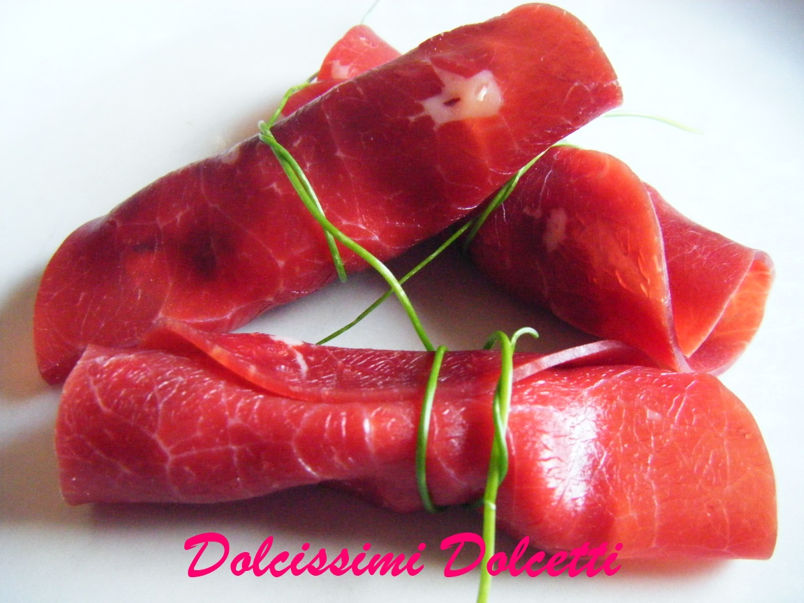 buonissimi involtini ripieni di formaggio: Si compra la bresaola fresca a fette Si impastano due cucchiai di gorgonzola 1 cucchiaio di philadelfia un ramo di sedano tritato un pizzico di pepe Riempite le fette di bresaola con l'impasto, chiudetele a involtino e irrorate con un filino sottile di olio..servite!