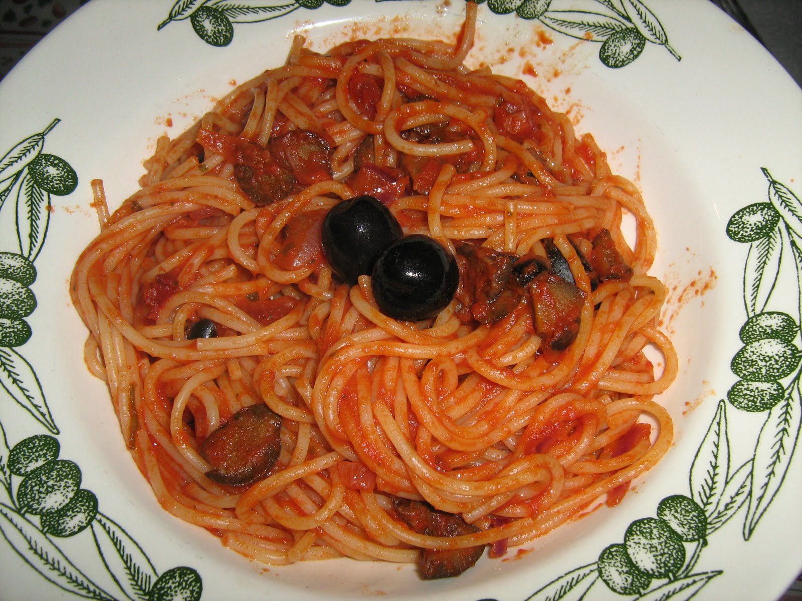 In un tegame far scaldare 7 dl di olio evo e farci dorare un grosso spicchio di aglio e un pezzetto di peperoncino piccante. Eliminare l'aglio e, fuori dal fuoco, aggiungere i filetti di tre acciughe dissalate che si stempereranno con una forchetta nell'olio tiepido. Unire 500 gr. (peso lordo) di pomodori rossi da salsa spellati, privati dei semi, strizzati leggermente e tritati al coltello, 100 gr di olive di Gaeta snociolate, 1 cucchiaio di concentrato di pomodoro e un pugno di capperi dissalati. Far cuocere per circa 25 minuti e condire con la salsa ottenuta degli spaghetti cotti al dente.