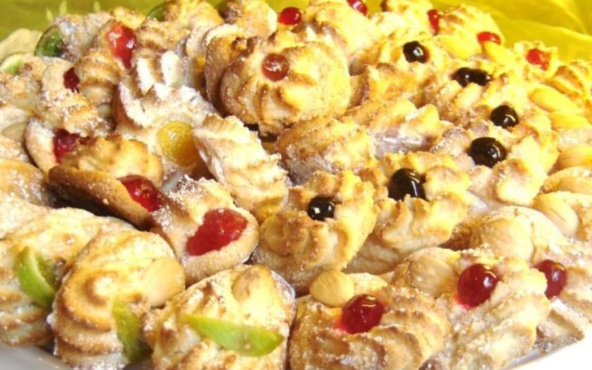 Impastare tutti gli ingredienti insieme, riporre in un contenitore e lasciar riposare in frigo per una o due ore. Inserire il composto in una sac à poches con bocchetto largo e rigato, quindi formare i pasticcini direttamente su una leccarda foderata da carta forno, inserire al centro di ognuno mezza ciliegina candita o una mandorla e cuocere in forno preriscaldato a 180°C per 15 minuti.
