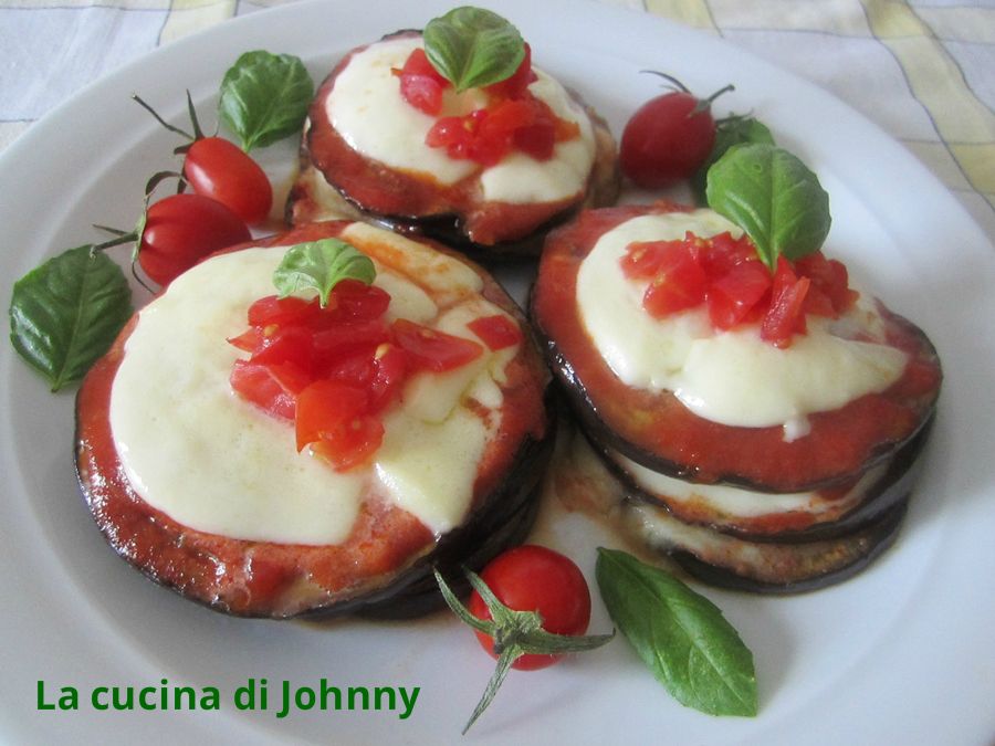 Disponete 8 fette di melanzana su un tagliere, cospargetele con meta del parmigiano, adagiatevi sopra una fetta di pomodoro, salatela, copritela con una fetta di mozzarella, proseguite con il pomodoro, il parmigiano rimasto e la melanzana. Schiacciate leggermente i sandwich con il palmo della mano per compattarli.
