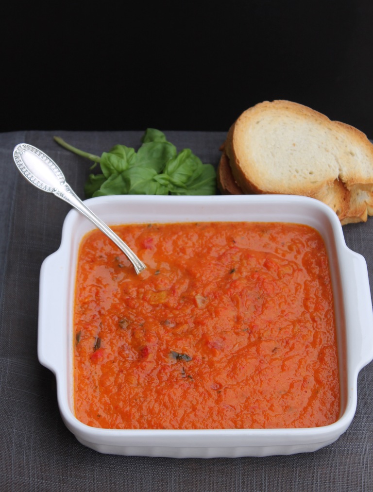 Una gustosa zuppa di peperoni e pomodori arrostiti, insaporita con carota, sedano, porro, prezzemolo e basilico. Da servire calda con crostini di pane.