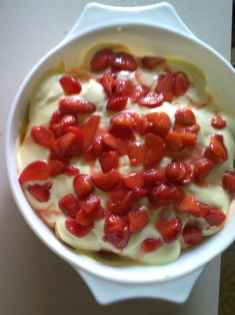 Alternare strati di savoiardi con uno di crema ed uno di fragole fino ad esaurimento degli ingredienti,