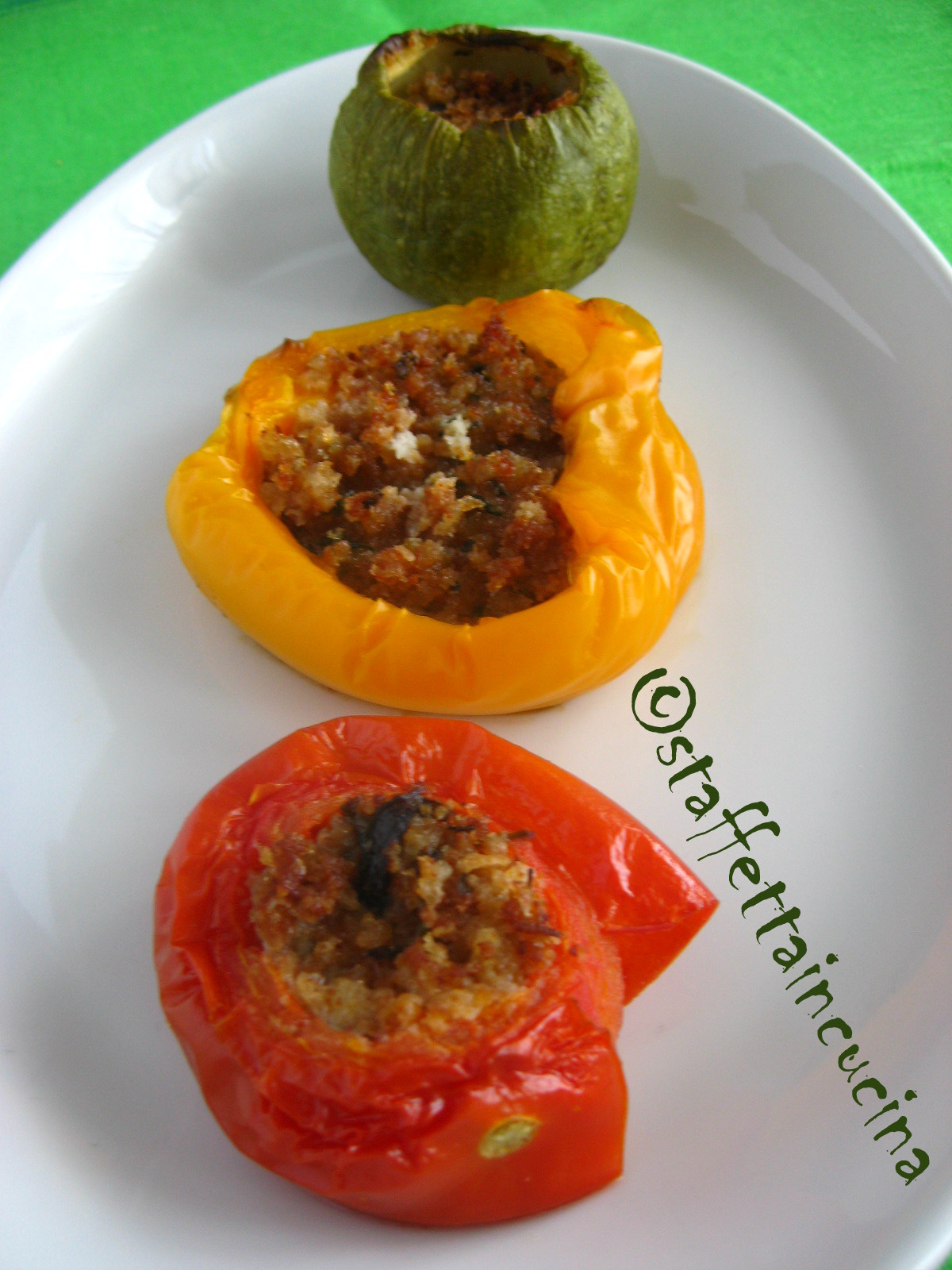Lavate i peperoni, asciugateli, tagliate la calotta con un coltellino affilato ed eliminate i semi interni. Lavate lezucchine, asciugatele, spuntatele, tagliatele a tronchetti alti 2 cm circa e asportate la polpa con uno scavino lasciandone un leggero strato sul fondo per non far uscire la farcitura.