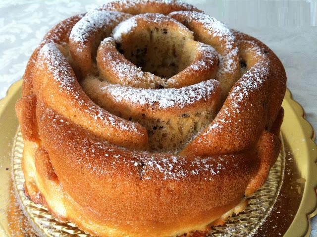 Montare a lungo le uova con lo zucchero fino ad ottenere un composto spumoso, aggiungere la farina setacciata con il lievito, poi il burro fuso e il latte e sbattere ancora a lungo con le fruste. Aggiungere le scaglie di cioccolato e dare un'ultima mescolata. In uno stampo a forma di rosa versare metà del composto, aggiungere qualche cucchiaino di nutella e ricoprire con il restante impasto. Cuocere in forno preriscaldato a 180°C per circa 30 - 40 minuti. Fare la prova stecchino fino a quando non risulterà asciutto.