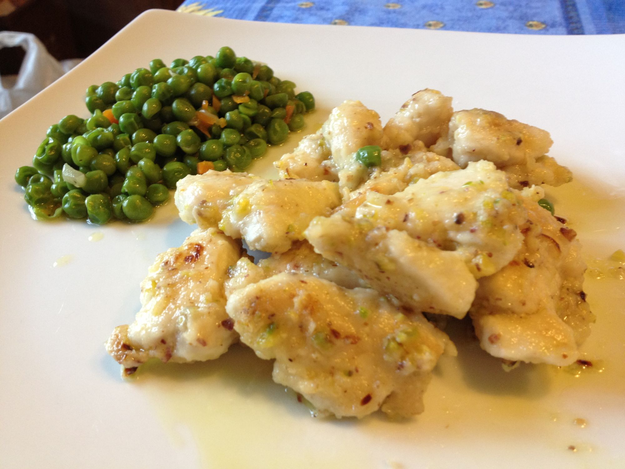 Salare e pepare a piacimento. Verso metà cottura sfumare con il mezzo bicchiere di vino bianco, quando il vino sarà evaporato distribuire la grandella di pistacchi uniformemente sui bocconcini.