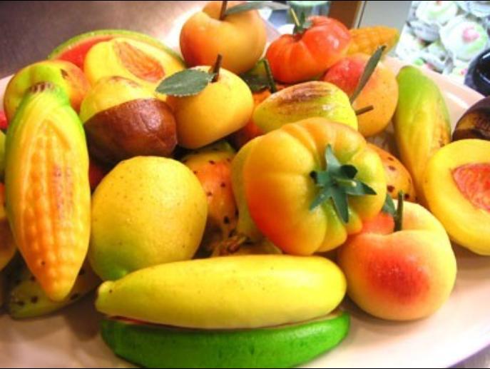 In un pentolino mettere l'acqua e lo zucchero a fuoco lento e mescolare fino a quando lo zucchero comincia a filare, quindi versare la farina di mandorle e continuare a rimescolare. Appena il panetto di pasta si stacca dalle pareti della pentola è pronta. Scendere dal fuoco e versare la pasta sulla spianatoia e far raffreddare, poi cominciare a lavorarla e formare gli stampi.