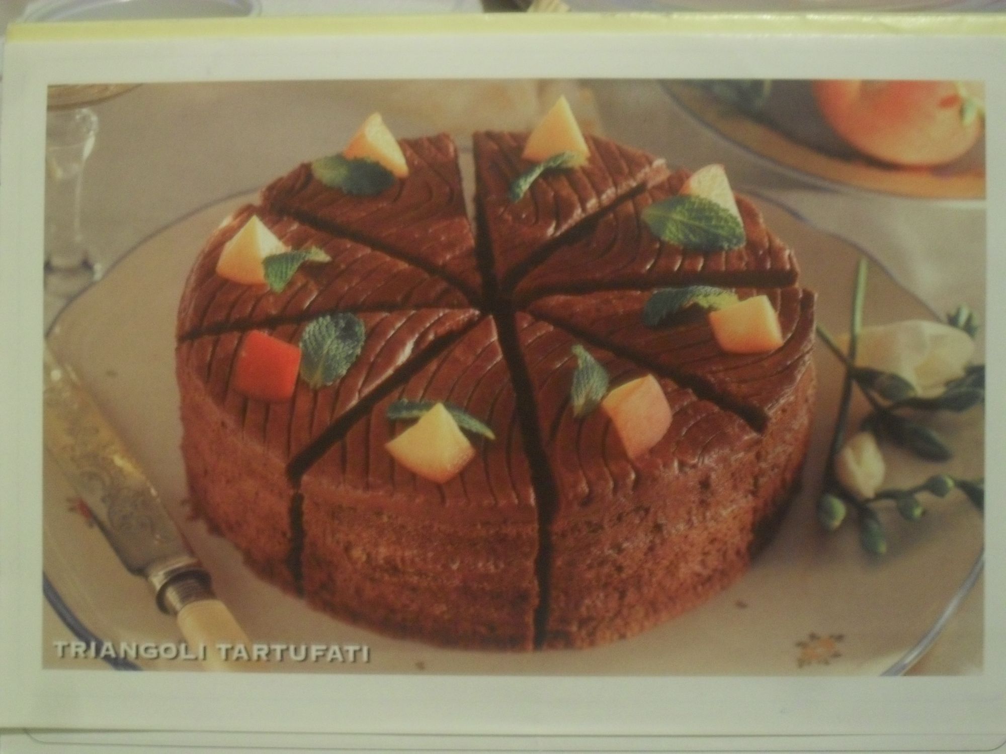 Togliere la pasta al cacao dal forno e lasciar raffreddare su un telo. Ritagliare la pasta in 3 dischi dal diametro di 16 cm e circondare il disco base con con una striscia di cartoncino da pasticciere alta 5 - 6 cm. Stendere uno strato di crema sul disco base e cospargere di mandorle tritate. Sovrapporre il secondo disco leggermente imbevuto di rhum e stendere un altro strato di crema. Spargere sulla crema la granella di mandorle rimasta e coprire con l'ultimo disco di pasta. Stendere su questo la crema rimasta e decorare con delle striature la superficie della crema. Mettere la torta ottenuta in frigo per 4 - 5 ore, poi staccare la striscia di cartoncino e tagliare il dolce in triangoli.