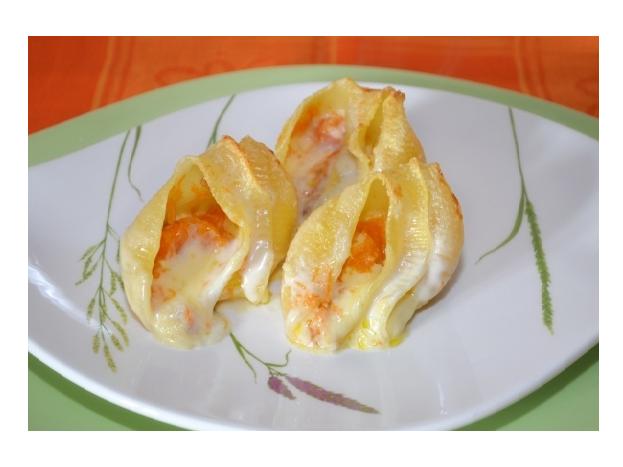 Servite i vostri conchiglioni ripieni di zucca e mozzarella nei piatti belli caldi caldi.