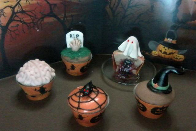 Decorazione con pasta di zucchero: ora siamo pronti per cominciare a dar sfogo alla nostra creatività e creare le piccole sculture da mettere sopra i nostri dolcetti di hallooween, potete realizzare 4 o 5 elementi diversi oppure un unico elemento per tutti i cupcakes, io consiglio sempre di alternare le sculture e come in questo caso potete fare il cervello, il cappello della strega, la lapide con la mano, il ragno con la sua tela, il fantasmino etc. Vi spiego come assemblare il Cappello della strega: prendete un pezzetto di pasta di zucchero che avete precedentemente colorato di nero e formate un cono, sformate la punta fino ad ottenere il classico movimento del cappello come si vede in foto, alla base formate con i polpastrelli le falde aiutandovi con i modelling tool per ottenere il movimento, adesso tirate con il mattarello un pezzettino di pdz verde e arancio ottenendo così dalla prima una striscetta alta circa 3 mm e con uno stampino ad espulsione ricavate la stellina dalla seconda, entrambi andranno incollati alla base del cappello. Ecco il vostro cappello realizzato. Adesso lascio spazio alla vostra fantasia per inventare e creare nuovi elementi rigorosamente spettrali!