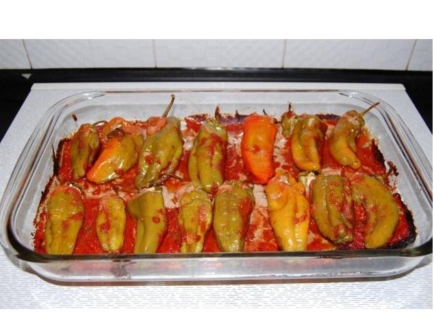 Ricoprire i friggitelli ripieni con passata di pomodoro,un filo d’olio, salare e infornare in forno caldo a 180° e cuocete per 30 minuti.