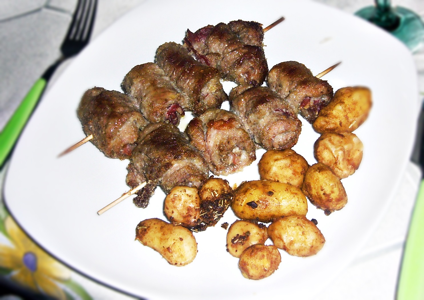 Mettere in un recipiente olio, aglio, rosmarino e aromi. Tagliare le fette di vitello in 2 per il lungo e metterle a macerare nell’olio una quindicina di minuti. Intanto, porre in forno le patate con olio, aromi, sale e pepe e far cuocere per 30/40 minuti e comunque finché saranno dorate. Togliere le fette di vitello dall’olio e stenderle su un piano dove andremo ad adagiare le fette di speck. Arrotolare su se stesse e infilzare con gli spiedini. Panare, mettere gli involtini su una placca, ricoperta di carta da forno, e infornare alla massima temperatura sotto il grill. Cuocere gli spiedini una decina di minuti per lato e servire accompagnati da patate novelle.