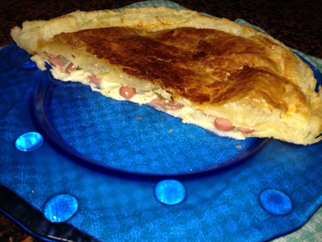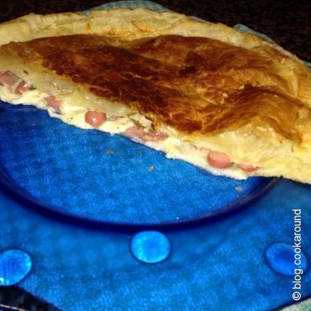 Stendere la pasta sfoglia su una placca da forno. Condire a piacere, salare e papare. Coprire con la seconda sfoglia e ripiegare il bordo si se stesso. Sigillare i bordi premendo con i rebbi di una forchetta. Spennellare con uovo sbattuto leggermente e infornare alla temperatura massima per 20 minuti circa