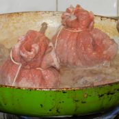Battere le fettine di carne per assottigliarle, quindi riempirle con i funghi e legarle a mò di sacchetto. Cuocerle a fiamma bassa nella stessa padella in cui sono stati cotti i funghi per circa 10-15 minuti, avendo cura di rigirare i sacchetti di carne per uniformare la cottura.