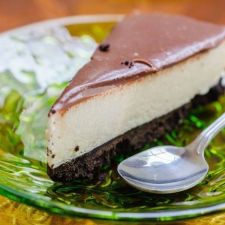 In una ciotola mettere la ricotta, il philadelphia, lo zucchero e mescolare bene ottendendo una crema liscia, versare poco a poco il latte e la menta. Mescolare bene il tutto e versare sopra la base di biscotti.