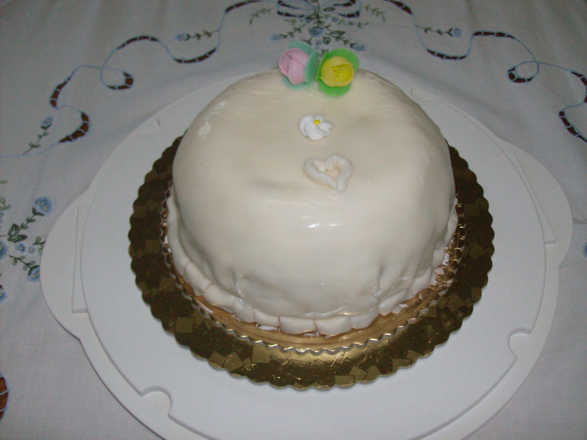 5-Capovolgere la cassata sul vassoio di portata,coprirla con un leggero strato di panna e far aderire la pasta di zucchero e decorare.