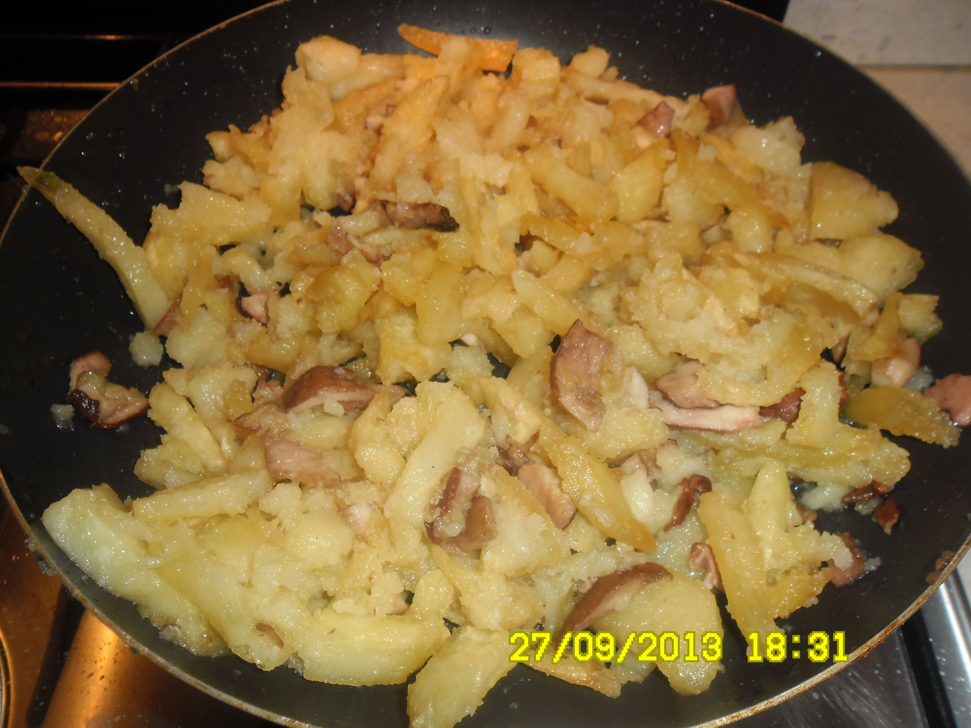 Tagliare le patate a tocchetti, passarle sotto l'acqua e asciugarle con un panno. Metterle in padella con abbondante olio, farle soffriggerle un pò, salare ed impepare. Coprire con un coperchio e stufarle per una mezz'ora rigirandole ogni tanto. Nel frattempo da parte in una padellina, mettere un filo d'olio evo e soffriggere i porcini tagliati a pezzi, cuocere 5 minuti e poi mettere da parte. Poi una volta che le patate sono diventate morbide, togliere dalla padella l'olio in eccesso ed aggiungere i porcini, accendere il fuoco e lasciar insaporire per qualche minuto. Servire ben caldo