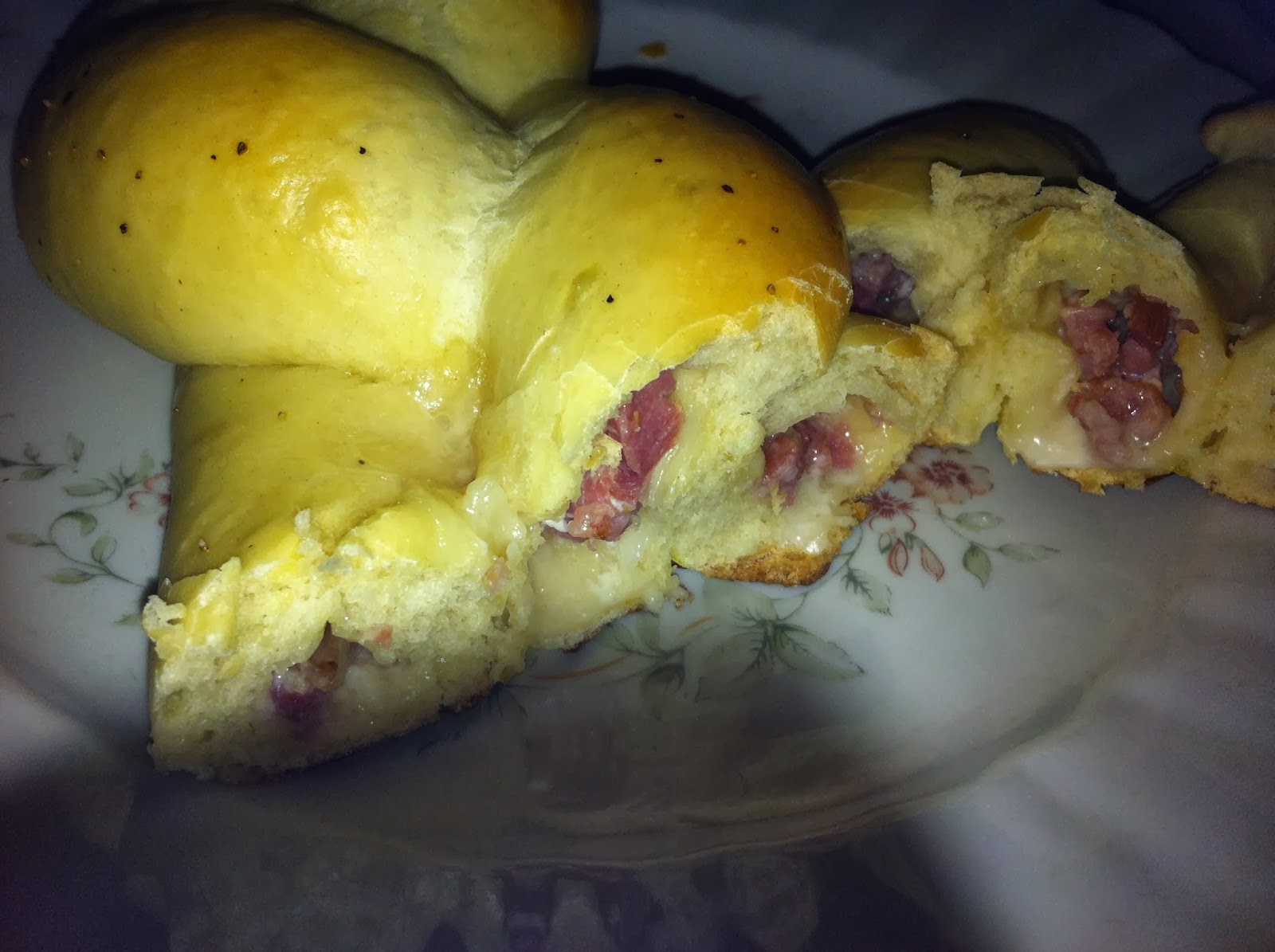 Riprendere l'impasto e dividerlo in 3 parti: stendere le 3 palle di impasto abbastanza sottili e dividere lo sfoglio ottenuto in 3 parti. Mettere nel centro la farcitura e arrotolare ognuna delle 3 parti con la sua farcitura, in modo da avere 3 cilindretti ben sigillati. Unire le 3 estremità e formare una treccia. Fare la stessa cosa con le altre parti dell'impasto, in modo da ottenere 3 trecce. Disporle sulla carta forno e farle riposare altri 3minuti. Spennellare con uovo sbattuto misto al latte. Cuocere nel forno a 180°C per circa 25/30 minuti.