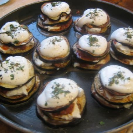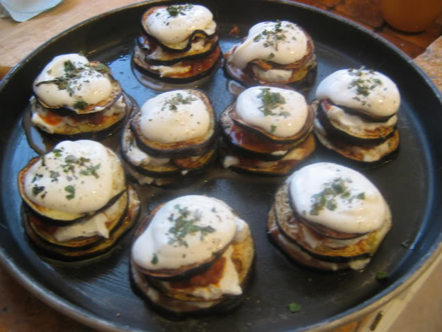 Tagliare le melanzane a fette non troppo spesse, metterle in una teglia e farle appassire in forno a 180° per 15 minuti. Tolte dal forno mettere su ogni fetta di melanzana un paio di cubetti di mozzarella e un cucchiaio di passata di pomodoro, un pizzico di sale e di pepe. Adagiare sopra un'altra fetta di melanzana e altro condimento. Infine, dopo, l'ultima fetta di melanzana, cospargere i "panini" con parmigiano e pan grattato.
