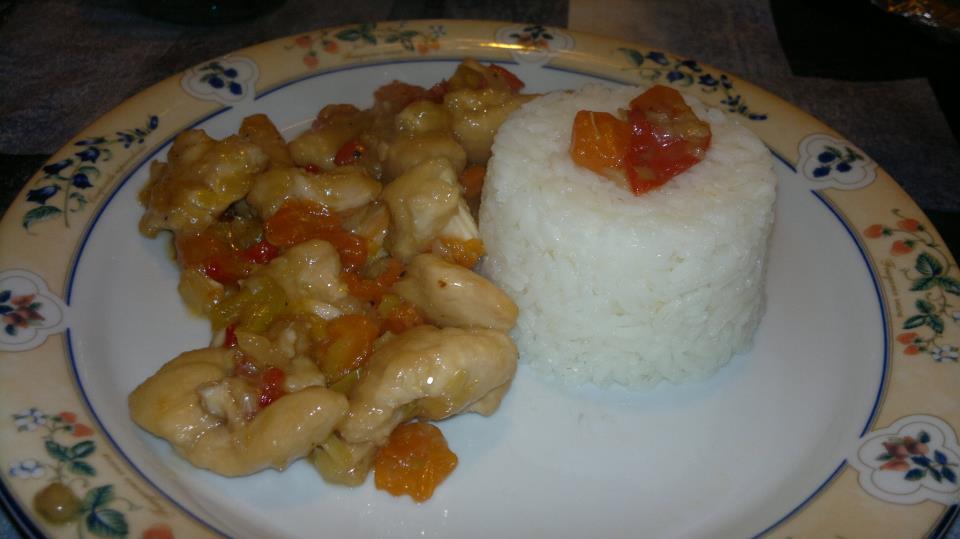- petto di pollo,salsa di soia,2carote,1peperone,1 cucc di fecola,sale,pepe,1porro,riso basmati