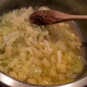 In una pentola, far sciogliere il burro con il cucchiaio di olio, unire i semi di cumino e poi i porri e le patate, facendo soffriggere per 15 minuti a fuoco basso.