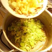 Lavare e affettare i porri e pelare le patate; tagliare poi le patate a cubetti non troppo grandi.