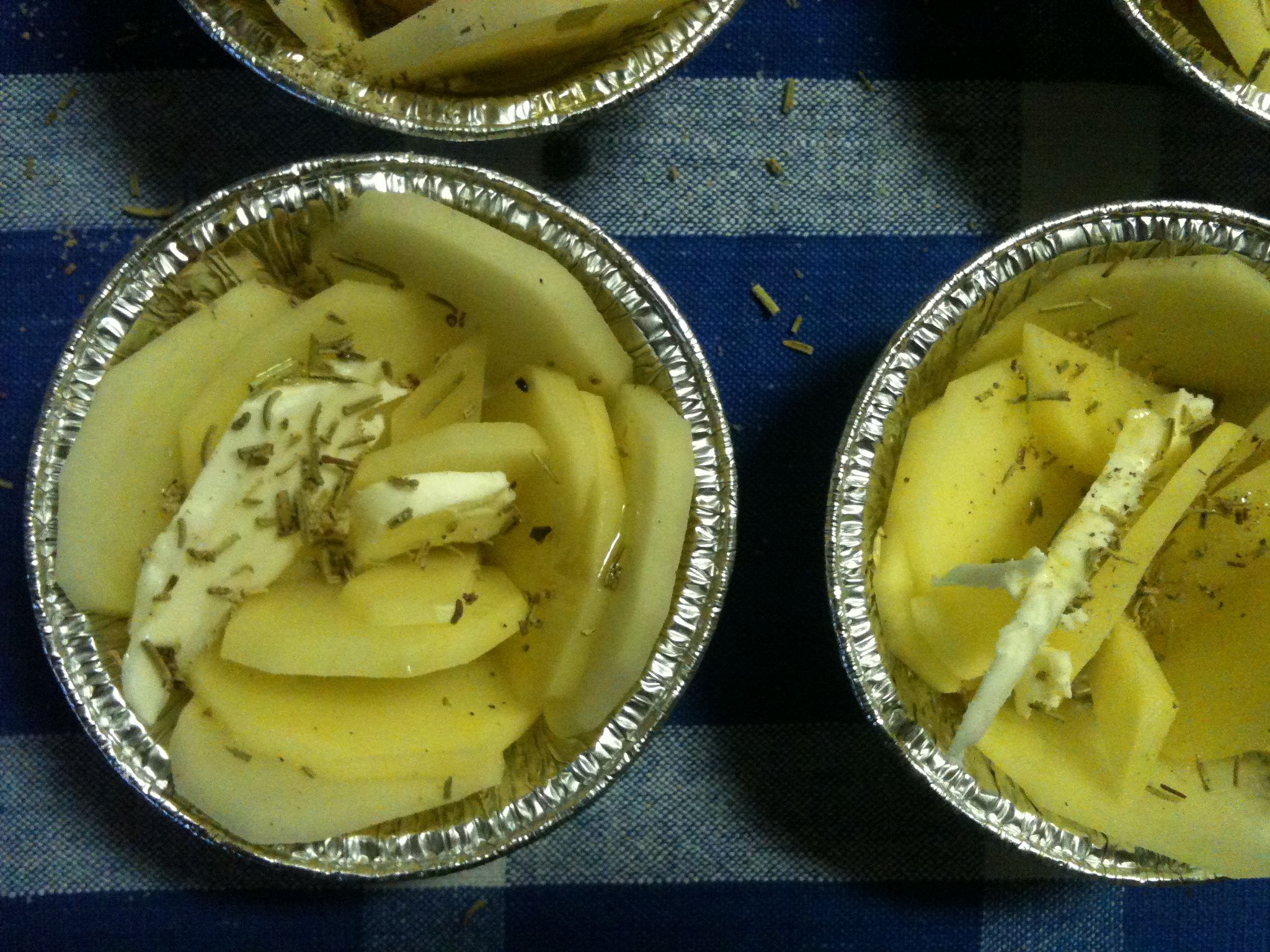 si tagliano le 4 patate a fette e si dispongono nei formini a forma di petali (per una migliore cottura quindi non sovrapposte) si mette una fettina di burro sopra, si spruzza con olio si aggiunge rosmarino e sale ( e appunto, per chi lo vuole, una spolverata di aglio): alle cosce si leva la pelle ( si tagliuzza la parte superiore per una miglior cottura) si mette il sale e il olio ( anche qualche odore particolare a seconda del gusto personale) ---> si mette tutto su una teglia con carta da forno e si inforna (forno ventillato 180°; forno non ventillato 160°) per 30 minuti