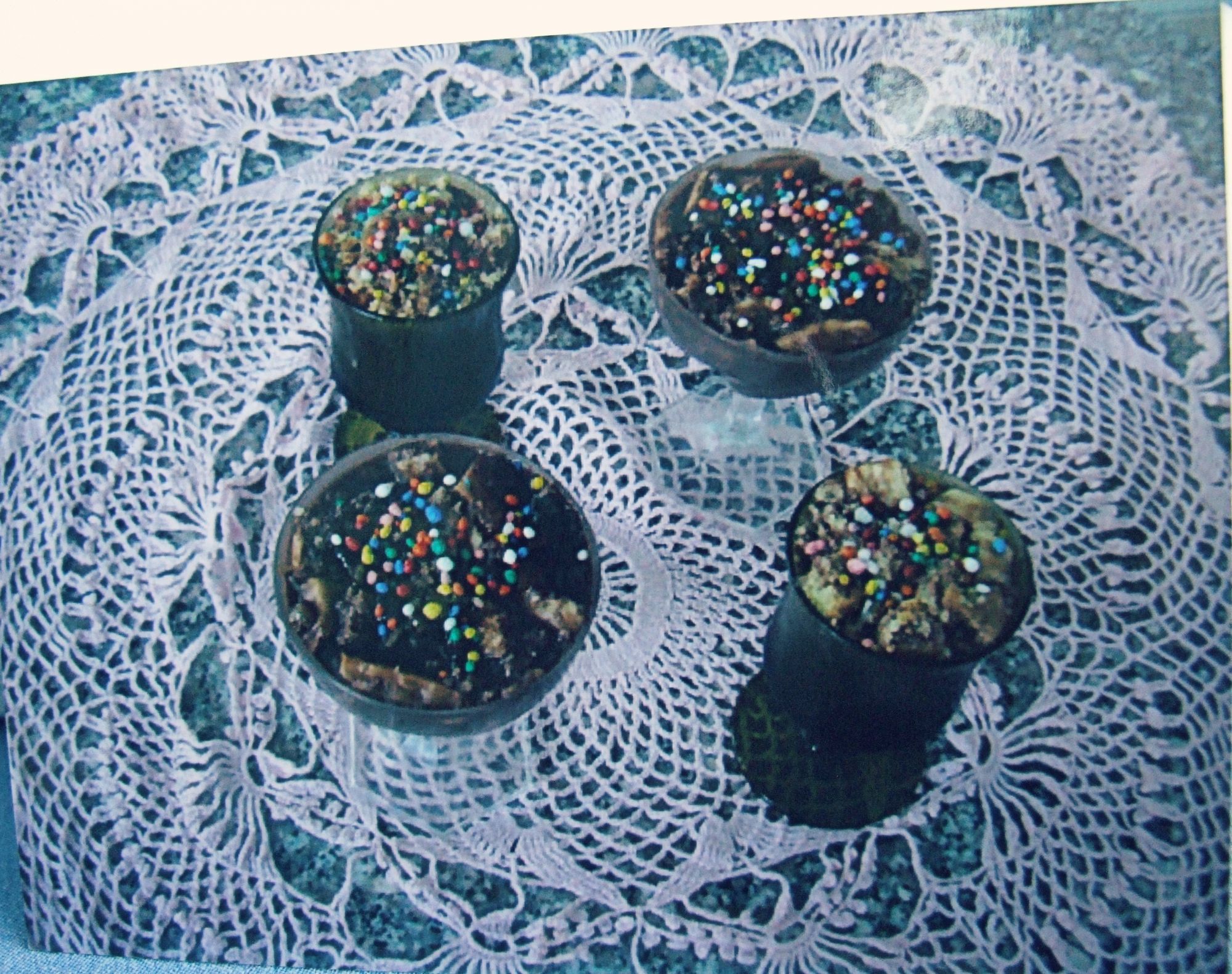 Separate i tuorli dagli albumi. Lavorate a spuma i tuorli e lo zucchero con uno sbattitore elettrico. Montate separatamente la panna e gli albumi ben fermi. Incorporate il cioccolato fuso alla spuma di tuorli. Unite la panna e gli albumi. Distribuite la massa nei bicchieri, coprite e mettete in congelatore per ca. 4 ore. Prima di servire, guarnite il semifreddo con le scaglie di cioccolato o con dei confettini e noci.