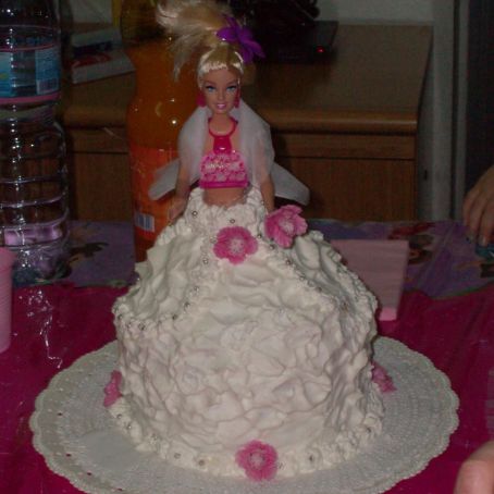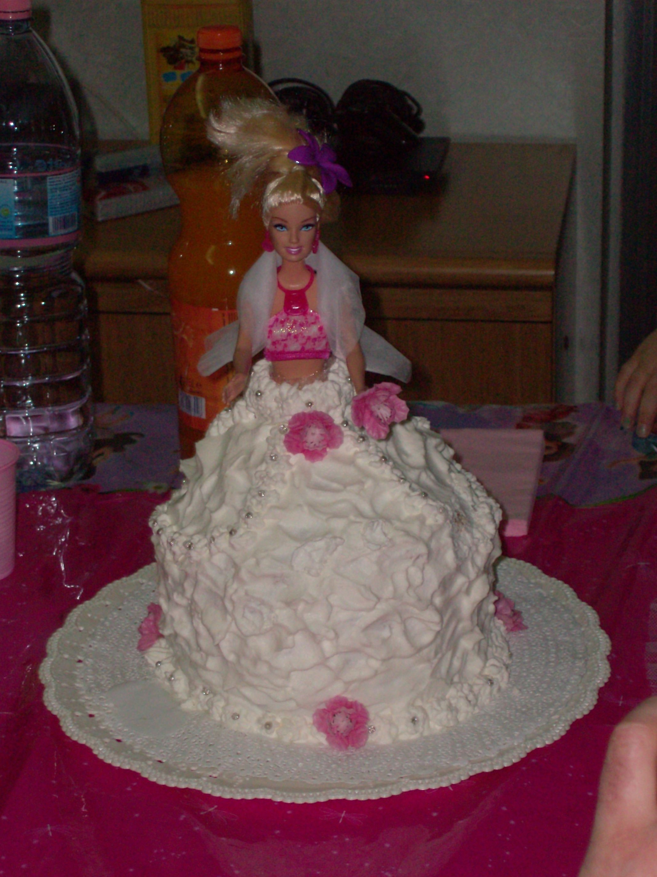 5-fare una bagna(a piacere) e farcire con crema chantilly e gocce al cioccolato e decorare.fare un foro al centro della torta e inserire la barbie.