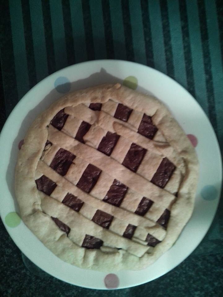 Avvolgete l'impasto in una pellicola e fatela riposare nel frigorifero per almeno mezz'ora. Dividere l'impasto in due parti. La prima la stendiamo nel tegame bucherellandola con la forchetta. Con un cucchiaio mettiamo la nutella e la stendiamo sulla base e infine ripieghiamo i bordi dell'impasto.