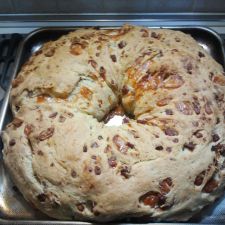 impastare tutto in una ciotola lavorare per 10',il composto deve risultare molto morbido,far crescere per 1h e 30'.stendere l'impasto e riempire con un misto di salumi e formaggi e spannellare con la sugna.chiudere l'impasto.imburrare una teglia a forma di ciambella mettere dentro l'mpasto riempito e far riposare per un'altra mezz'ora.cuocere in forno a 200°per 40'