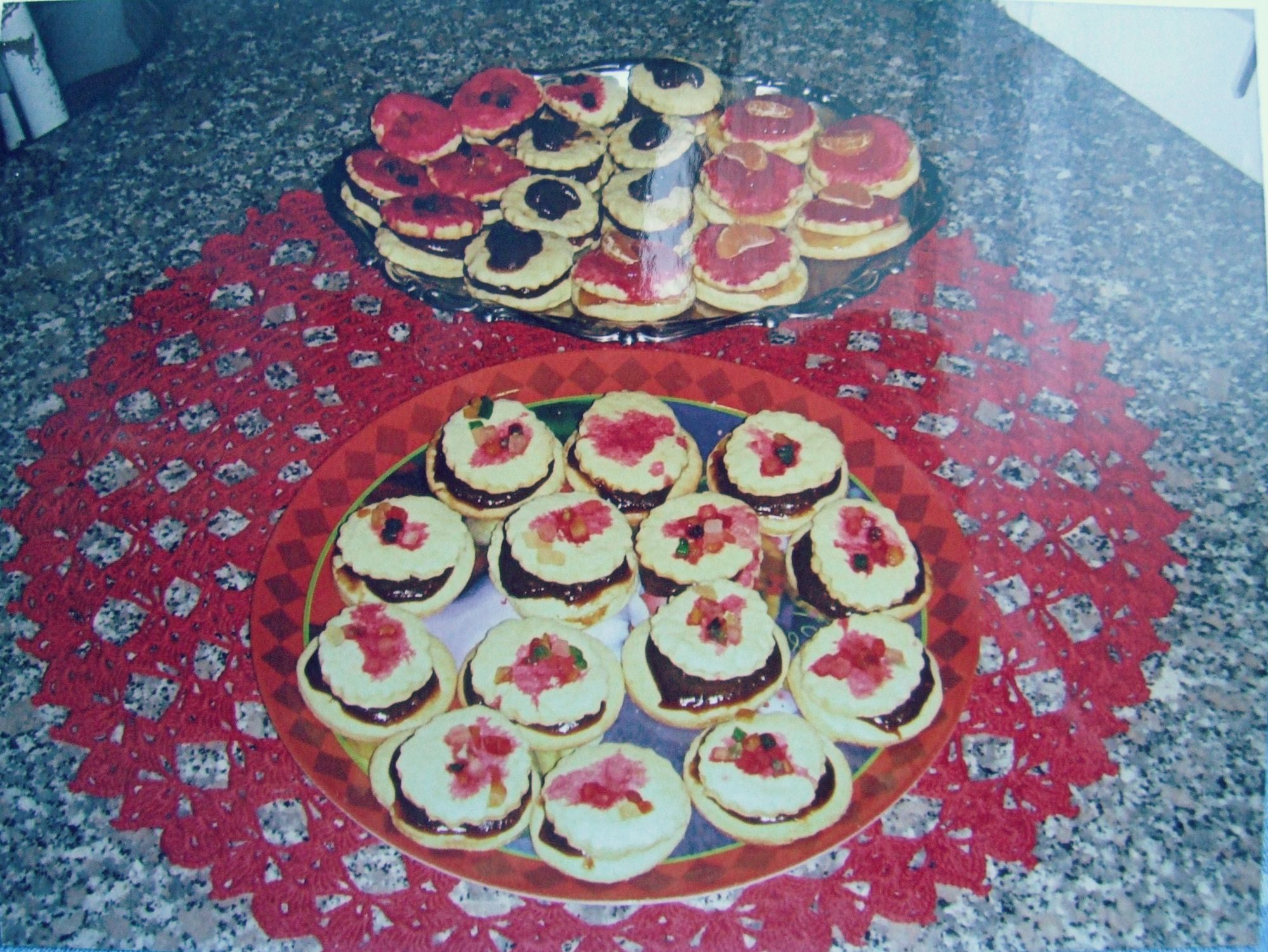 Stendete la pasta sul piano infarinato ad uno spessore di 4 mm e ritagliate dei dischi con un taglia biscotti smerlato di 5 cm di diametro. Trasferite i dischetti su una placca foderata con carta da forno e cuocete nel forno preriscaldato a 180 °C per 12 minuti. A cottura ultimata fate raffreddare su una gratella.
