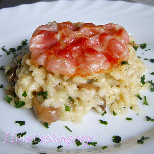 Pulire i funghi rimuovendo l’estremità del gambo. Lavarli bene per rimuovere la terra e tagliarli a spicchi. Immergere i funghi così tagliati in acqua e limone e lasciarli in ammollo per 10 minuti. Versare l’olio in una pentola capiente e aggiungere i funghi, il peperoncino, il prezzemolo e un pizzico di sale. Lasciare cuocere a fuoco medio con il coperchio finché i funghi non saranno cotti. Quando i funghi saranno cotti e la loro acqua di cottura sarà ritirata, aggiungere il riso e farlo tostare. Aggiungere in seguito un bicchiere di vino bianco e mescolare per bene. Quando il vino sarà evaporato aggiungere un mestolo di brodo vegetale caldo. Ripetere l’operazione quando il riso sarà di nuovo asciutto, sempre continuando a mescolare, finché non raggiungerà la cottura. A cottura ultimata spegnere il fuoco e aggiungere una noce di burro e un cucchiaino abbondante di gorgonzola dolce. Coprire e lasciare riposare per due minuti. Nel frattempo rosolare le quattro fette di pancetta su una piastra antiaderente finchè non saranno dorate. Passati i due minuti, impiattare il riso adagiandovi sopra la pancetta e spolverando con il prezzemolo tritato rimasto.