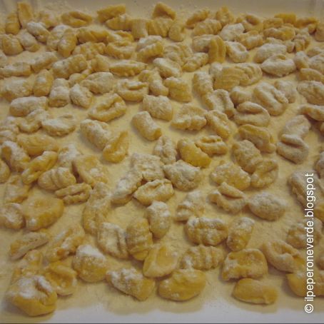 Lessare le patate con la buccia. Una volta cotto il tutto, schiacciare la zucca con lo schiacciapatate e fare la stessa cosa con le patate sbucciate. Lasciar raffreddare la purea. Una volta fredda unire le uova e la farina. Amalgamare bene gli ingredienti e aggiustare di sale, pepe e noce moscata. Non lavorare troppo l'impasto. Se occorre aggiungere un po' di farina, ma non troppa altrimenti si rischia che gli gnocchi si induriscano in cottura. Dividere l'impasto in più pezzi e fare tante strisce da tagliare poi a pezzetti. Passare ogni gnocchetto sui rebbi di una forchetta facendolo rotolare premendo con il pollice. Si realizzeranno così le striature.