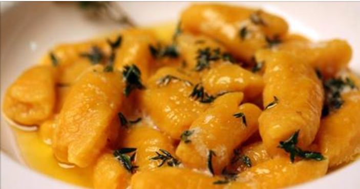 Cuocere gli gnocchi nell'acqua bollente e scolarli non appena vengono a galla. Versarli nella padella con il burro fuso e condirli.