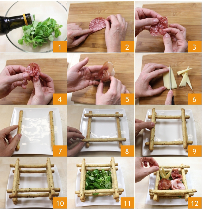 Con gli sfilati alle olive formate una "scatola": in un piatto da portata con base quadrata ponete due sfilati verticali e paralleli fra loro (7), quindi sovrapponetene, alle estremità, altri due orizzontali per formare un quadrato (8). Procedete allo stesso modo per creare un secondo quadrato che andrete a sovrapporre al primo (9), quindi terminate con due sfilati verticali (10). Adagiate ora il songino all’interno della scatola (11), quindi posizionate le rose di salumi, una accanto all'altra, e gli spicchi di formaggio (12). La scatola di sfilati alle olive con salumi e formaggi è pronta per essere servita in tavola.