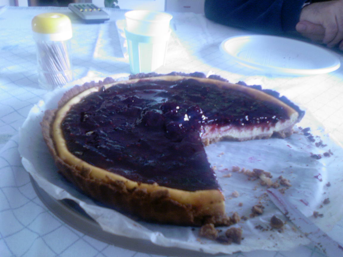 Sfornate la torta e completate spalmando sulla crema di formaggi il composto di marmellata e frutti di bosco.