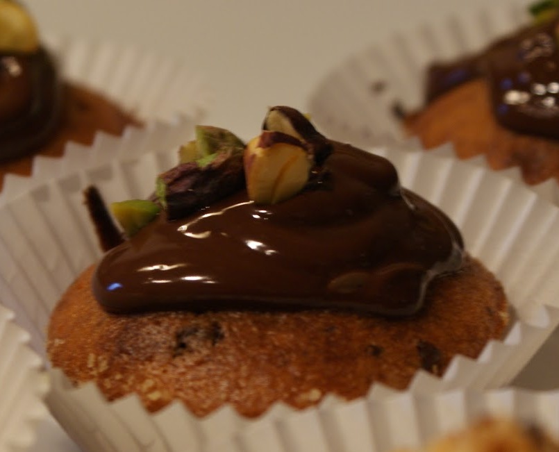 Levate i muffins dal forno, fateli intiepidire, guarniteli con il topping al cioccolato e mettete sulla sommità di ognuno un pistacchio tostato.