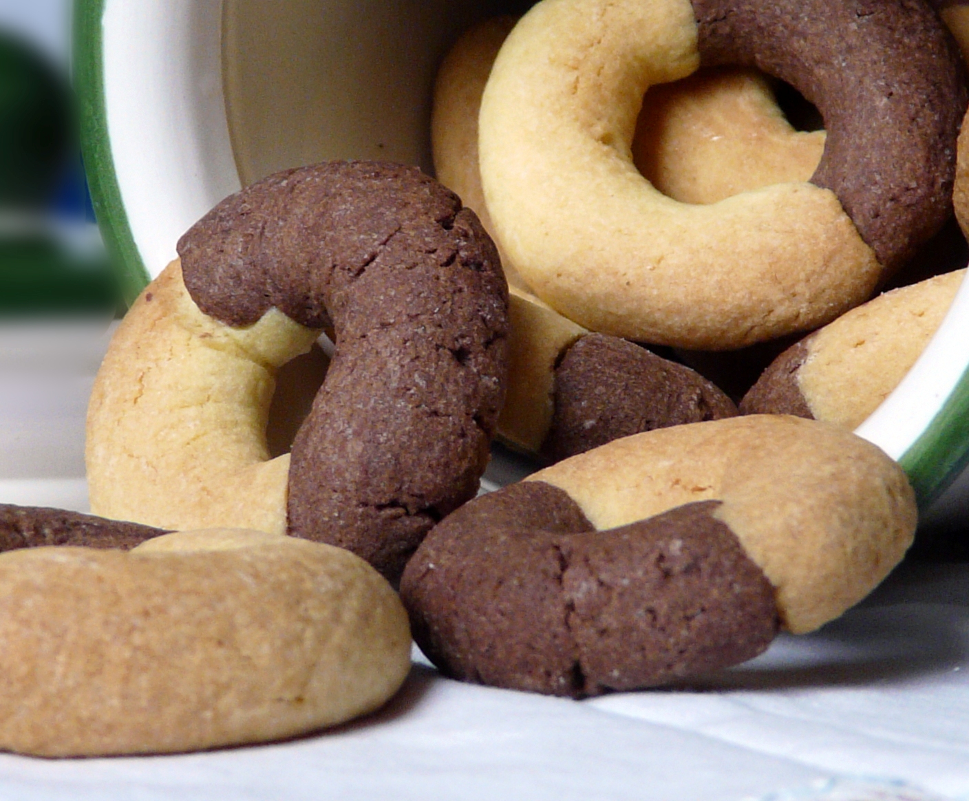 Con queste noci, formate dei salsicciotti del diametro di circa 1 cm e non più lunghi di 6 cm, unite poi il salsicciotto al cacao con il salsicciotto “neutro” ad una estremità; poi adagiatelo su una spianatoia infarinata e formate un cerchio unendo le altre due estremità. Avete così dato la forma ai vostri abbracci.