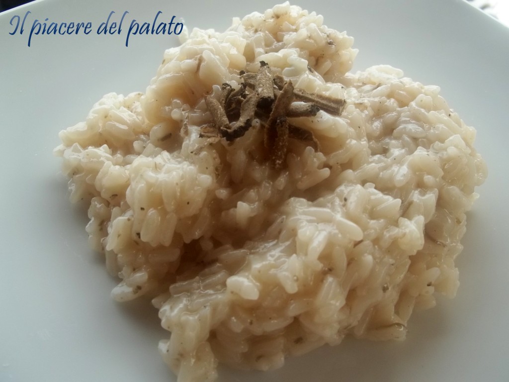 In una pentola lasciare appassire la cipolla con il burro, senza farle prendere colore. Unire il riso e lasciarlo tostare per qualche miuto. Sfumare il vino e lasciarlo evaporare. Aggiungere poco alla volta il brodo, che avrete preparato a parte. Continuare la cottura per circa 15 minuti, mescolando per non fare attaccare il riso alla pentola. Prendere il tartufo e grattuggiarlo a listelle sottili, lasciandone da parte un pezzetto. Mettere in un pentolino l’olio e aggiungere le scaglie di tartufo. Tenere il fuoco basso, l’olio deve appena scaldarsi e non bollire. Togliere dal fuoco il risotto e mantecarlo con l’olio al tartufo e il formaggio grattuggiato. Servire ben caldo con lamelle di tartufo affettate appena prima di servire.