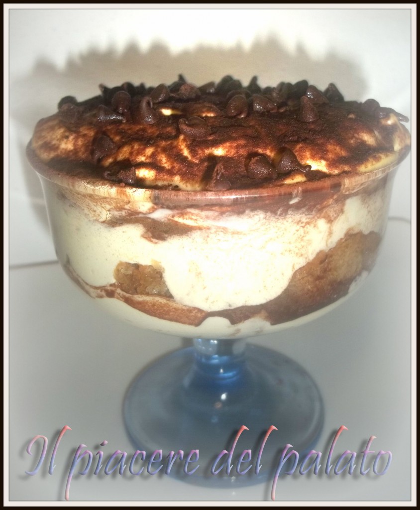 Separare i tuorli dagli albumi. Mettere in una casseruola i tuorli con lo zucchero e sbattere per qualche minuto con uno sbattitore elettrico. Vi risultera’ un composto cremoso e gonfio. Incorporate il mascarpone continuando con lo sbattitore, in modo da ottenere una crema leggera ma compatta. Lasciate riposare e nel frattempo preparate il caffè con la vostra moca e in un’altra casseruola montate gli albumi a neve, con un pizzico di sale. Saranno pronti quando il composto, piegando la casseruola, rimane fermo e non scivola verso i bordi. Con un mestolo di legno versate pian piano gli albumi montati a neve, nella crema di mascarpone. Mescolate delicatamente con movimenti dal basso verso l’alto, in modo da non smontare il tutto e per creare una crema soffice e spumosa. Prendete ora una pirofila (la grandezza è tipo la teglia delle lasagne). Versate il caffè in un piatto fondo ed aggiungete il liquore (senza esagerare con le dosi :-D ). Con l’aiuto di un cucchiaio, disponete un po’ della crema di mascarpone sulla base e iniziate con il primo strato. Imbevete nel caffè i savoiardi, due alla volta, uniteli per strizzarli un po’, altrimenti il caffè vi cola. Posizionate i savoiardi uno accanto all’altro. poi ricopriteli con la crema, una spolverata di cacao amaro e cospargete le gocce di cioccolata. Continuate allo stesso modo anche per il secondo strato. Di solito non ne vengono piu’ di due, ma dipende dalla grandezza della vostra pirofila. Al termine riponete in frigorifero per almeno un paio d’ore.