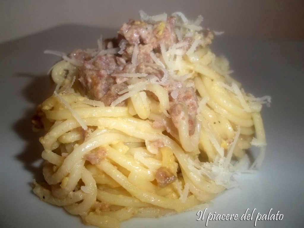Spelate il salame, apritelo a metà e fatelo rosolare in un filo d’olio. Una volta rosolato mettetelo nel mixer e tritatelo senza ridurlo in poltiglia. Rimettete sulla pentola ed aggiungere la panna, che avrete stemperato con la farina di castagne. Aggiungete qualche cucchiaio dell’acqua degli spaghetti, che nel frattempo avrete messo a cuocere con dell’acqua salata. Lasciare sul fuoco qualche minuto, a fiamma bassa. Poi spegnete e sbattete i tuorli con il sale e il pepe. Una volta cotti gli spaghetti, versateli nella pentola e amalgamate con il sugo a fiamma dolce. Aggiungere alla fine i tuorli e servire con una spolverata di parmigiano.