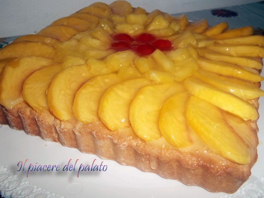 Fate sobbollire il latte con la vaniglia, poi togliere dal fuoco e lasciare il bacello ancora una decina di minuti. In una terrina sbattere con uno sbattitore elettrico, i tuorli con lo zucchero fino ad ottenere un composto cremoso e gonfio. Togliere la vaniglia e versare a filo il latte, continuando a sbattere. Aggiungere la farina setacciata. Rimettere il tutto sul fuoco e far raggiungere il bollore. Tenere a fiamma moderata, continuando a mescolare fino a quando il composto non si addensa. Togliere dal fuoco e lasciar intiepidire, mescolando di tanto in tanto per evitare la formazione di grumi. Versare la crema sulla torta e posizionare la frutta che avrete tagliato in precedenza.