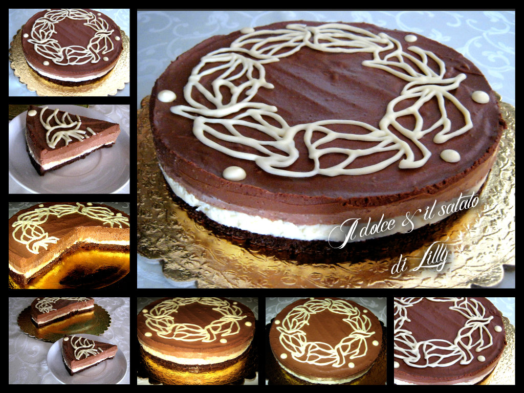 Se volete stare più tranquilli, preparatelo la sera prima, fatelo stare in frigo tutta la notte e sformatelo il giorno successivo. Decorare la superficie del vostro cheesecake triple chocolate a piacere (io in questo caso ho realizzato un centrino di cioccolato bianco che ho messo sulla superficie quando era ben freddo).