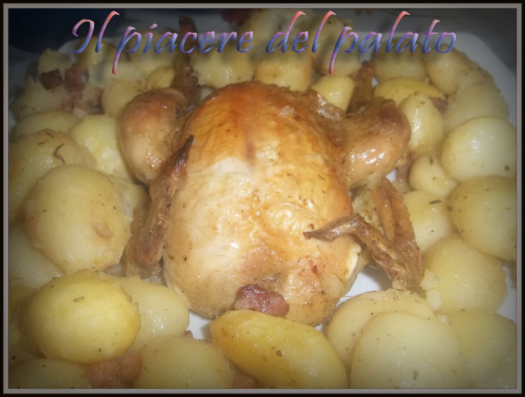Prendere il galletto e riempirlo con il rosmarino, la salvia e una piccola manciata di pancetta a cubetti. Spennellare una pirofila con un pò di olio. Mettere il galletto al centro della pirofila. Aggiungere l’acqua, cospargere il galletto con l’insaporitore e mettere sopra di esso la restante pancetta. Cuocere in forno a 180° per un’ora. Dopo mezz’ora dalla cottura, girare il galletto ed aggiungere le patate novelle. Cospargere un pizzico di sale sulle patate. Rimettere in forno e finire la cottura.