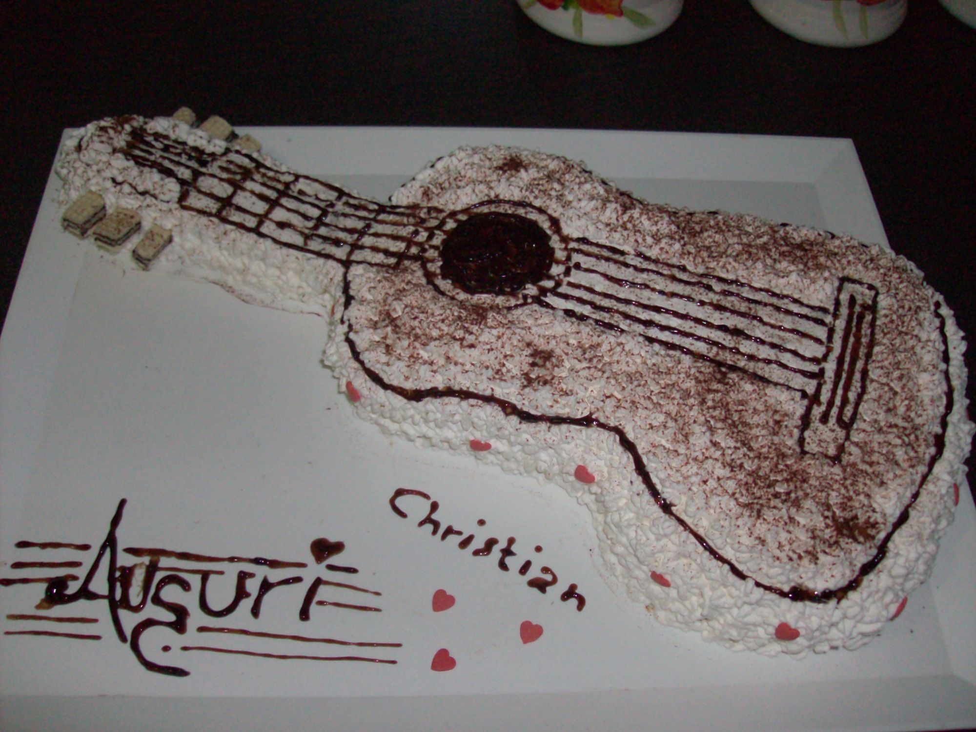 A questo punto ho diviso la torta ritagliata a metà in senso orizzontale e l’ho farcita con crema di mascarpone(non potevo fare più strati, dato che dovevo tenere la torta piuttosto bassa, per dare l’effetto chitarra). Ho assemblato il corpo della chitarra al manico e ho appoggiato il tutto sul vassoio finale.infine decorarla con la panna
