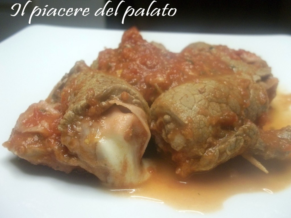 Prendere una pentola, versare la polpa di pomodoro ed aggiungere le due spezie. Tenere la fiamma bassa per almeno una decina di minuti, in modo da far prendere gli aromi alla polpa. Aggiungere eventualmente un paio di cucchiai di acqua, se vedete che asciuga troppo. Per ogni fetta di carne mettere sopra una fetta di mortadella e una listella di formaggio. Arrotolare e fermare con uno stuzzicadenti. Mettere gli involtini insieme alla polpa e girarli ogni tanto per farli cuocere completamente. Sono pronti in pochi minuti. Se il formaggio esce un po’ dall’involtino non preoccupatevi. Lo ha fatto anche a me e vi assicuro che rende il sugo ancora piu’ sfizioso.