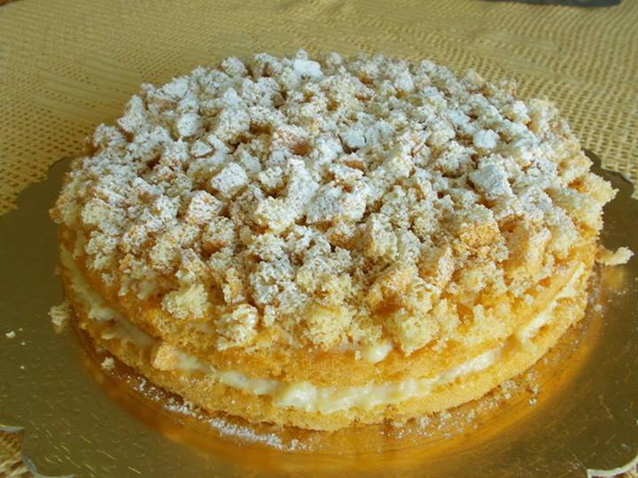 Ho distribuito sulla torta i dadini di pandispagna che avevo tenuto da parte ed ho spolverizzato tutto con abbondante zucchero a velo.
