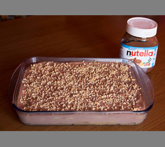 Bagnare velocemente i savoiardi nel caffè-latte e sistemarne uno strato in una pirofila, coprire con la crema alla nutella. Fare allo stesso modo tutti gli strati che si desiderano. Chiudere il tiramisù con la crema alla nutella e decorare con la granella di nocciole.