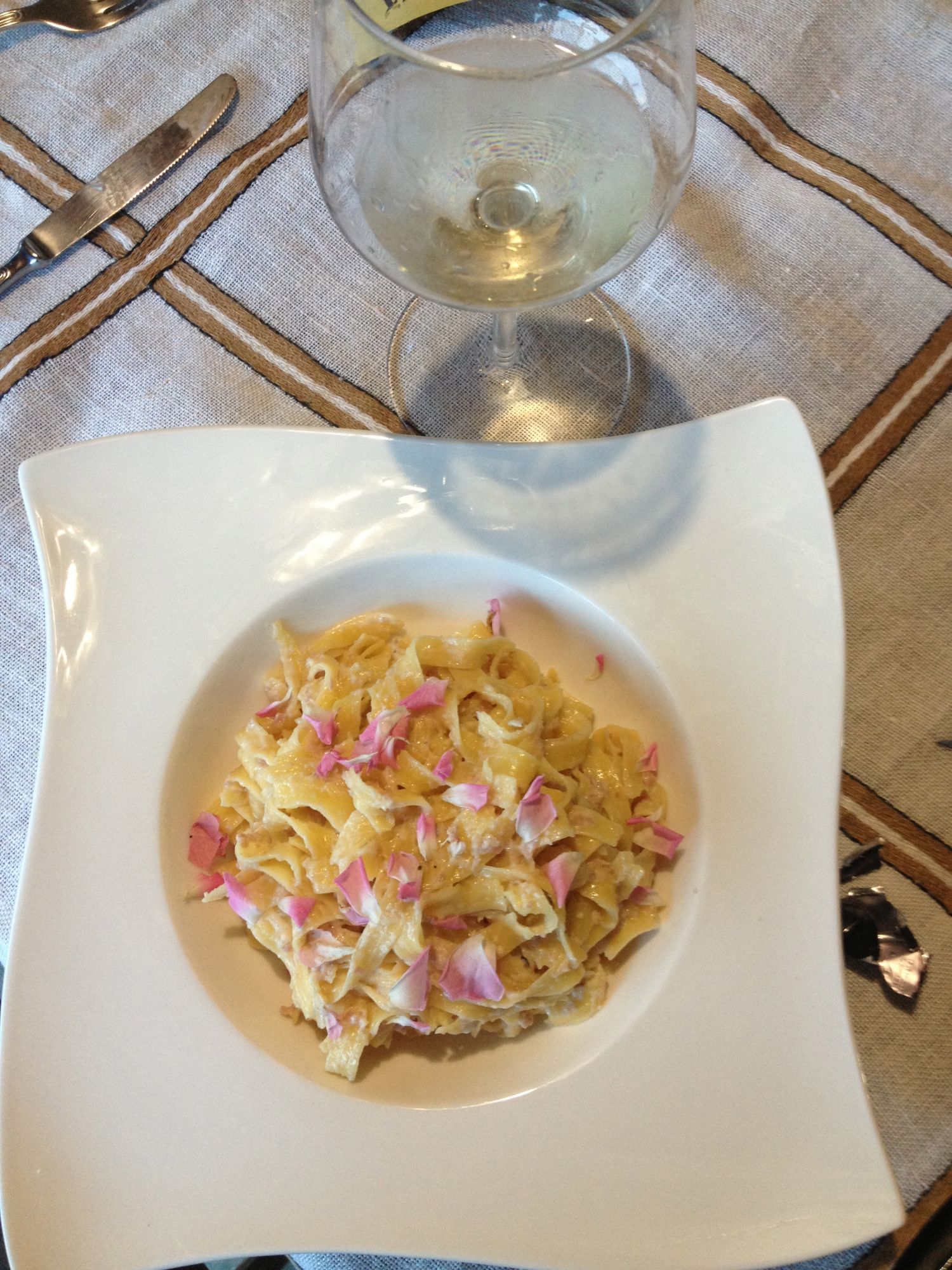 Intanto fate lessare le tagliatelle, e quando saranno cotte scolatele, versatele nella padella e amalgamatele bene col sugo; versate poi la pasta in un piatto fondo e decorate con i petali che avete tenuto da parte. Da servire immediatamente.